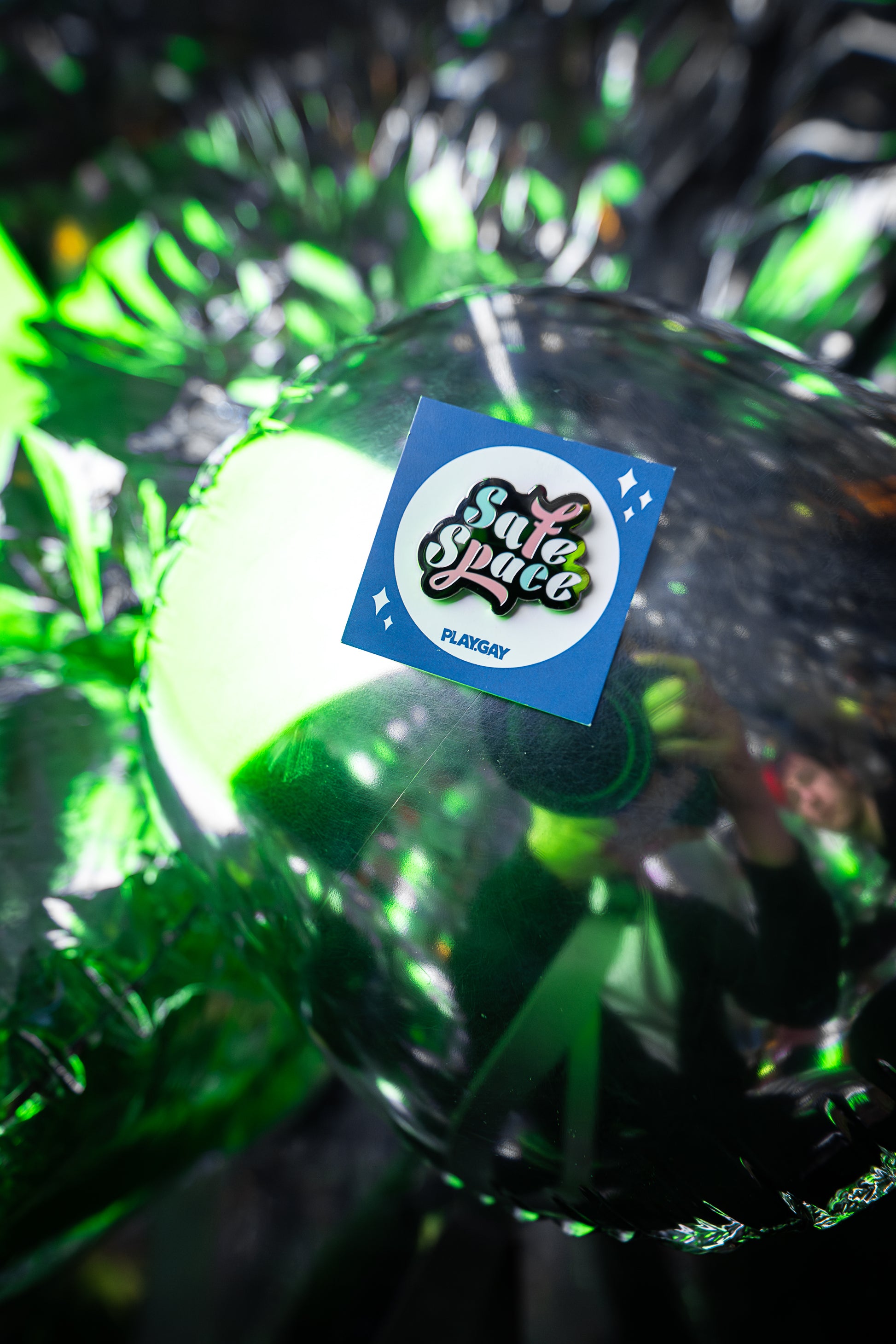 This 35x30mm silver-plated hard enamel pin features the text "safe space" in cursive script.